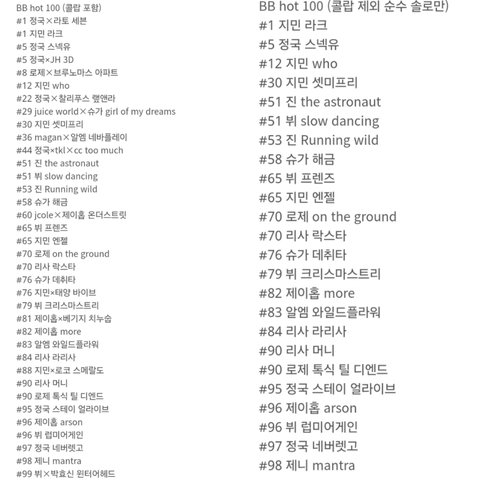 하위권은 슈가,알엠,진,제이홉,제니인듯...!