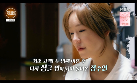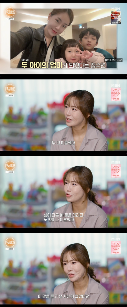 정수연은 두 번의 이혼 사실에 대해 “(사람들이) 두 번 이혼했대. 성이 다른 애 둘을 데리고 두 번이나 이혼했대. 이 말을 듣고 살 자신이 없었다”라고 솔직하게 밝혀 눈길을 끌었다.