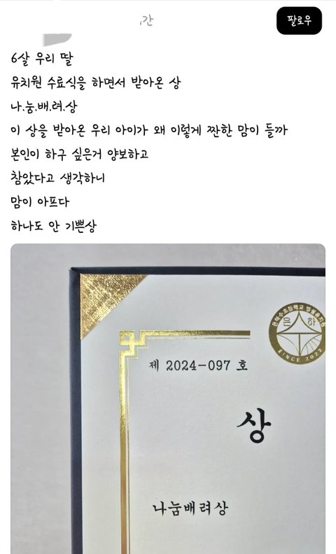 유치원에서 준 상장이면 애들 다주는 건데 특출난게 없으니 선생님이 짜내고 짜낸 상인건데 감정이입... 6살이 나누고 배려를 했으면 얼마나 했을거라고... 상받았구나 신나서 기쁘게 칭찬이나 많이 해주면 될 걸..