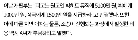 빅힛은 여태까지 펑펑 놀고 방치하고 있다가 타 소속사에서 소송 거니까 그때서야 숟가락 올린 주제에 왜 5천만원씩이나 받아감? 니네가 뭘 했다고? 어이가 없네? 그리고 정작 피해자인 뷔와 정국이 받는 보상금이 저게 맞아? 직접적으로 피해를 본 아티스트 위주가 아닌 회사 본인들이 피해본 내용 위주로 소송 걸었을 것이 뻔히 보여서 ㅈㄴ 기분나쁘네