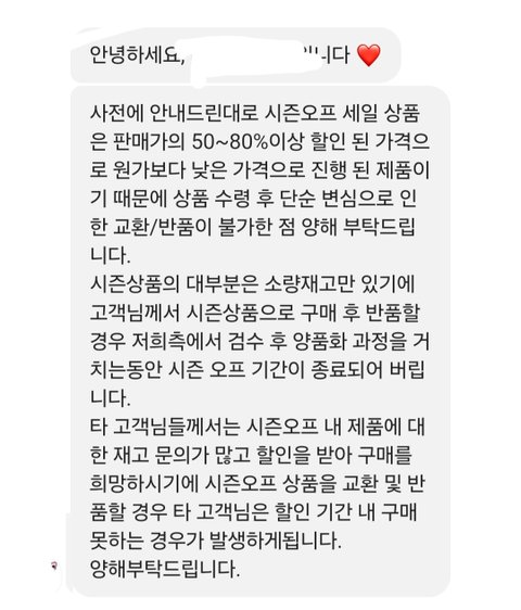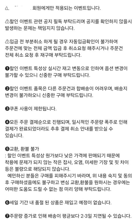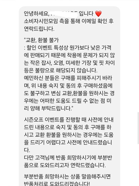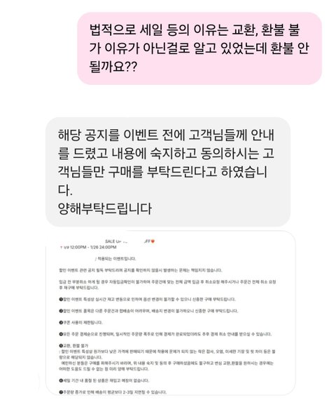 세일을 하길래 바지를 샀어. 이 브랜드는 옷에 조금 관심있는 사람이면 무조건 알 만한 브랜드고, 사장도 인플루언서 팔로워 n십만 명이야. 근데 입어보니 핏이 마음에 안 들어 환불하고 싶다고 했는데 문의를 했더니 세일 상품이라 환불이 안 된다는 거야. 사실 난 그 공지를 못 봤는데 쇼핑몰에서 공지를 해 놓긴 했더라. 하지만 세일로 인한 환불 불가는 위법행위야. 공지를 해 놓았더라도 법적 효력이 없어. 그래서 위 사항을 언급하며 환불 요청했는데 거절 당해서 소비자원에 신고 넣었고 2주동안 연락이 안 오길래 다시 상담사분께 여쭸더니 답변이 없다고, 한 번 더 메일 보내보고 그때도 답장 없으면 구제 신청 도와주겠다고 하셔서 알겠다고 했어. 그리고 다음날 즈음에 쇼핑몰에서 연락이 왔어. 답장은 본래 환불은 어렵다고 사전에 공지했으나 고객님께서 환불을 원하시니 해주겠다는 식으로 왔어. 사실 위법행위를 했으며, 소비자원에서 연락하니 겨우 환불해줬으면서 본인들이 선심쓰듯이 말하는게 기분이 나쁘고 마지막엔 앞으로 본인들 쇼핑몰에 이용 제한이 있을거라 하더라고. 사실 이 일 이후 소비하고 싶지도 않았지만 본인들이 위법행위를 했고 그걸 지적했다는 이유로 먼저 이용 제한을 거는것도 기분이 썩 좋진 않네. 이 사건 이후로 다른 쇼핑몰들도 다시 보니 세일 기간에 환불, 교환 금지 많더라. 연예인들이 많이 입고 정말 유명한 브랜드들도 그러네. 옷 관심 조금이라도 있으면 다 알만큼 유명한 브랜드들이라 그냥 떠오르는 브랜드들 세일상품 봐 보니까 세일상품 환불/반품 불가 거의 다 써있더라. 무신사에 들어가 있는 브랜드들 많은데 무신사에는 이런 문구가 위법 행위라 못 쓰는데 자기네들 쇼핑몰 사이트에선 써 놓네. 또 예전 다른 인플루언서가 화장품류 공구하는데 환불 불가라는 멘트 써 있기도 하더라. 이거 다 위법 행위고, 주문제작 상품도 환불 금지 많던데 주문제작 상품이 정말 한 사람의 신체적 특징 or 디자인적 취향을 반영한것이 아닌 규격이나 디자인이 정해져 있는 단순히 1:1 제작이라 주문제작이라는 타이틀을 쓰는 주문제작 상품은 환불 가능 상품이야. 또 흰색 환불 불가 등등 이거 다 위법행위야. 분명 환불 불가라는데 왜 샀냐, 너도 문제다 라는 사람들 많을 거 같지만 난 모르고 샀고, 설사 내가 알고 샀더라 하더라도 그건 소비자 문제가 아니라 위법 행위를 하는 쇼핑몰이 잘못됐다고 생각해. 사건 종결 후 소비자원 측에서 확인 차 연락 주셨는데 쇼핑몰 측에서 본인들이 환불을 해 줘야되는거냐고 되물었다 하더라. 상담사님께선 당연히 해 줘야되는거라고 하셨대. 암만 인플루언서가 하는 쇼핑몰이라지만 어떻게 그 업계에서 일하면서 기본적인 법 조차 모르나 싶기도 하더라. 이런 위법 문화가 없어졌으면 좋겠네. 다들 소비자로서 당연한 권리는 보호받으며 소비생활하면 좋겠다. 긴 글 읽어줘서 고마워