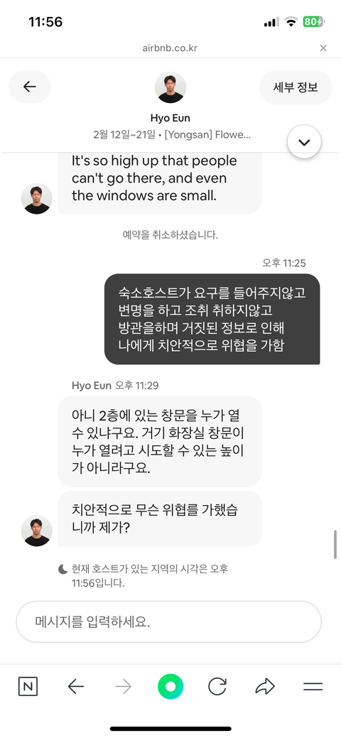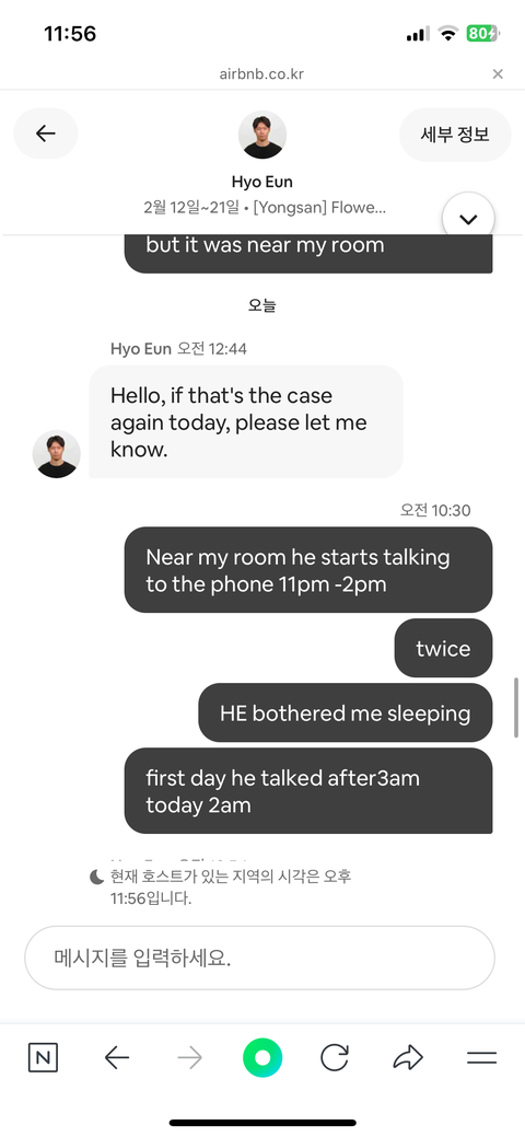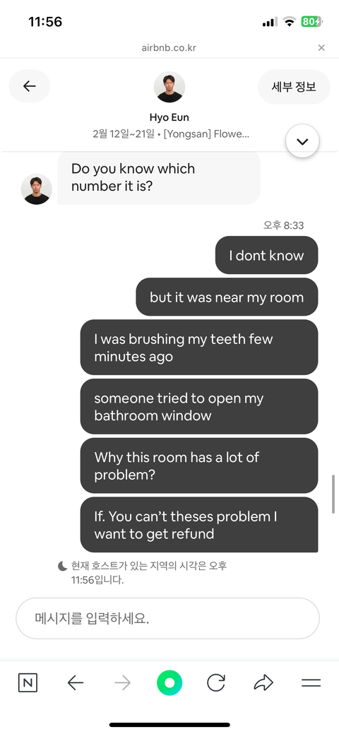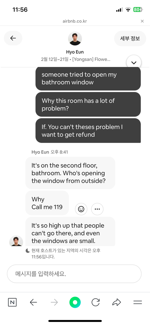 1일차에숙소에서옆방사람이통화를새볔3시넘어서했었고2일차때도새볔2시가 넘어서 통화를 했었는데호스트는아무런 조취를 취하지 않고 무슨호냐한번만더그랬을경우말을해라그리고3일차에제가세수를하는도중모르는사람이창문을열려고했습니다호스트가 아무런 조취를하지않고되려뻔뻔스러운대응을합니다 창문이 갑자기 흔들리는걸 제가 목격했습니다