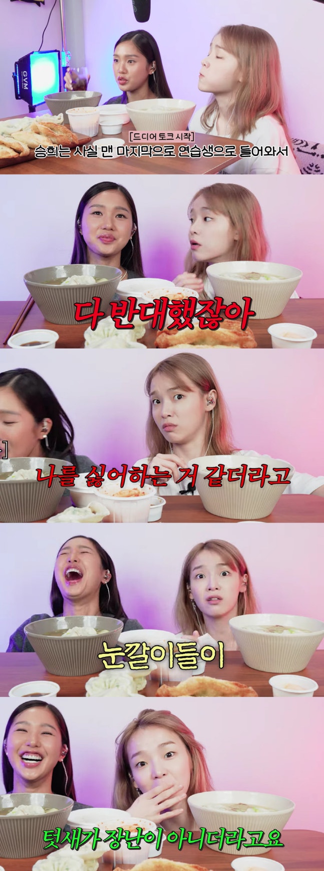 이에 승희는 "한 명 들어오면 꼭 한 명은 방출이라는 거다"라고 공감하면서도 "딱 봐도 나를 싫어하는 거 같더라. 효정언니도 입은 웃고 있는데 눈이 (무서웠다). 텃세가 장난이 아니더라. 자기들이 오디션 때 했던 걸 다 해야 된다더라. 기분이 처음부터 상했다"라고 멤버들을 폭로했다.