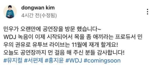 김동완은 지난 15일 개인 트위터 계정에 신화 멤버인 이민우와 함께 찍은 사진을 올렸다. 뮤지컬 '서편제'에 출연 중인 그는 "민우가 오랜만에 공연장을 방문했다"며 "WDJ 녹음이 이제 시작되어서 목을 좀 아끼라는 프로듀서 민우의 권유로 유튜브 라이브는 11월에 재개할게요"라고 썼다.