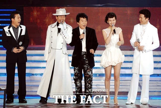 후배가수들한테는 늘 포근하고 따뜻했던 그가 남긴 메시지는 '감사' '배려' '덕분에'였다. 고 송대관이 생전 방송출연 당시 모습, 사진 왼쪽부터 박상철 태진아 송대관 장윤정 강진. /더팩트 DB◆ 59년 가수인생, '차표한장' '네박자' '정때문에' '한번더'에 고스란히