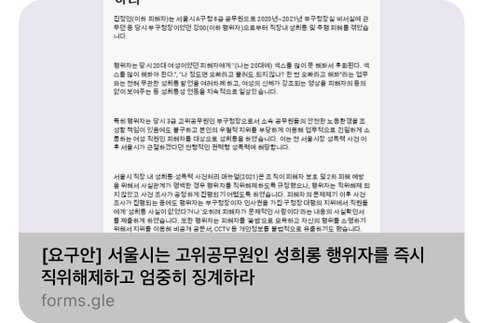 *** 아래의 구글 폼으로 같은 뜻을 지닌 분들의 연명부를 받고 있습니다. 서울 시민이거나 서울에 직장을 두고 계신 분들께서는 적극적으로 참여하여 다시는 이와 같은 일이 발생되지 않도록 대한민국의 미래를 지켜주시기 바랍니다. 성희롱은 권력자에 의해 남녀 상관없이 벌어질 수 있는 소위 “갑질”입니다. 꼭 관심을 가져주세요!!