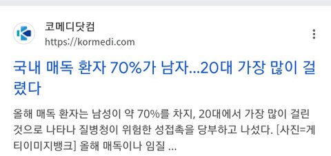 누가 보면 남자 70%가 매독이라는줄 알겠네 호들갑 ㅅㅂㅋㅋㅋ 원나잇만 갈겨대지마 애초에 성병 신경쓰는 애가 할지는 모르겠다만