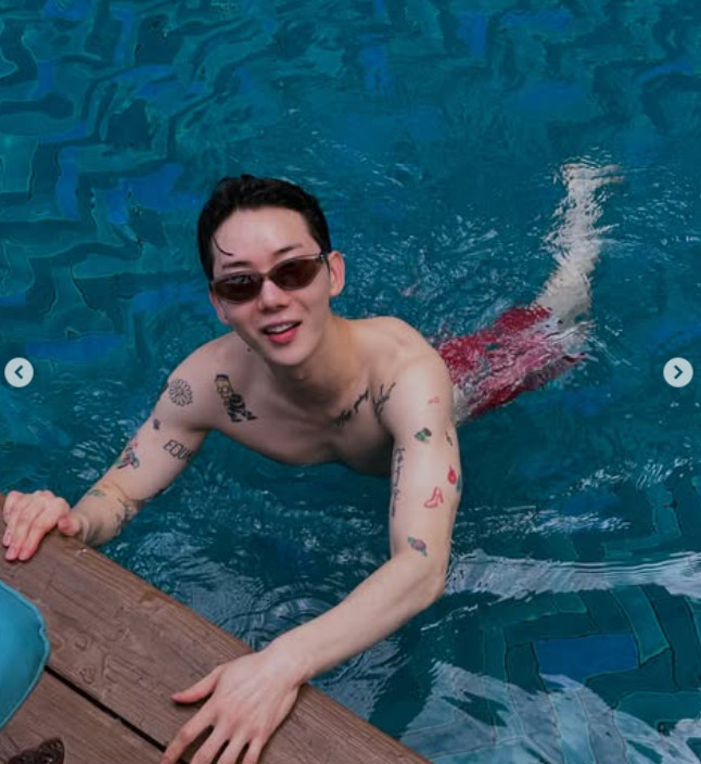 특히 수영장에 들어가 있는 사진에서는 탄탄한 복근 등 근육질 몸매를 공개해 감탄을 자아낸다. 온몸을 휘감은 크고 작은 타투들도 놀라움을 더했다.