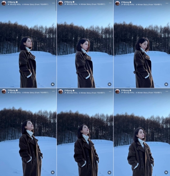 이민정. 사진 | 이민정 SNS이어 흰 폴라티셔츠에 고동색 코트를 입고 분위기를 잡았다. BGM도 영화 ‘러브레터’의 ‘A Winter Story’로 분위기를 더해 변함없는 소녀미의 느낌을 살렸다.
