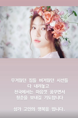 서유정, 미교 SNS배우 서유정은 SNS에 “이 땅에서 별이 되기까지 힘들었을, 하늘에선 영원히 떨어지지 않는 별로 행복하게 지내라, 견디고 사느라 고생 많았다”고 추모했다.
