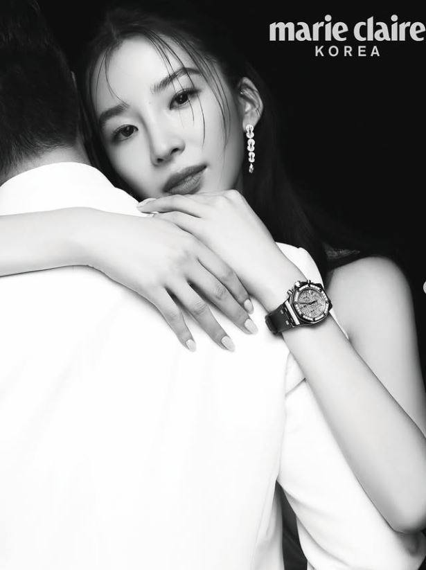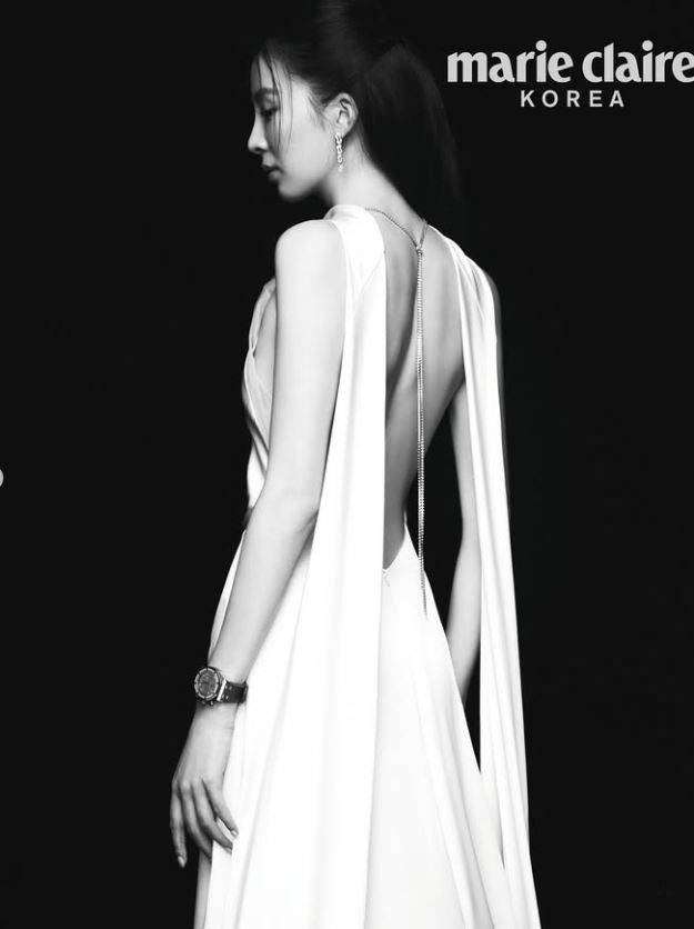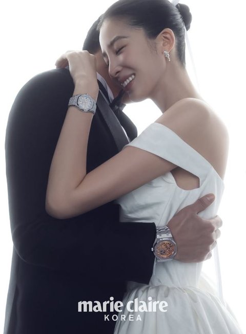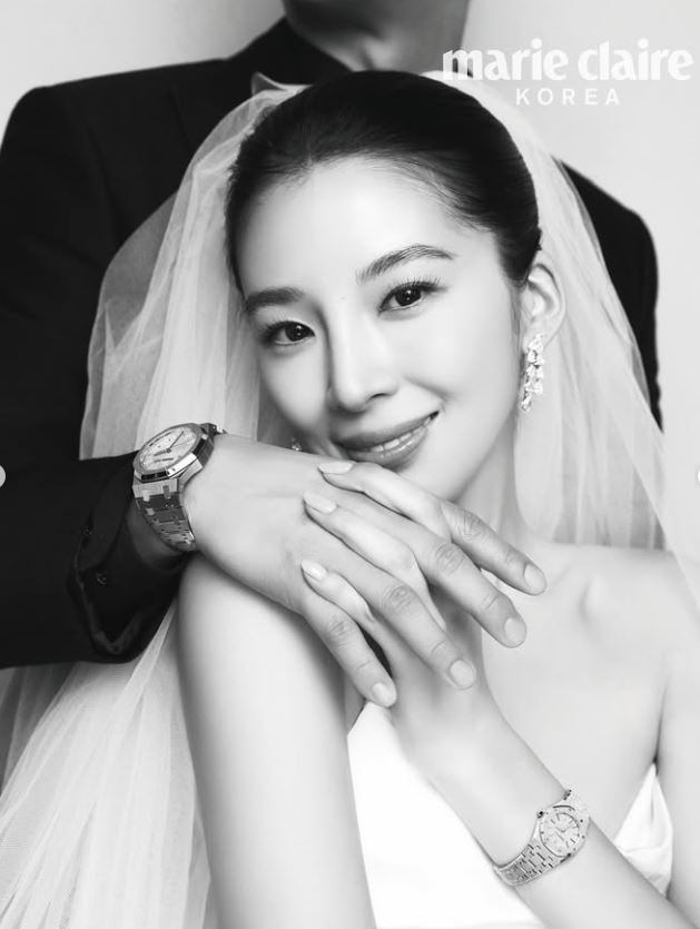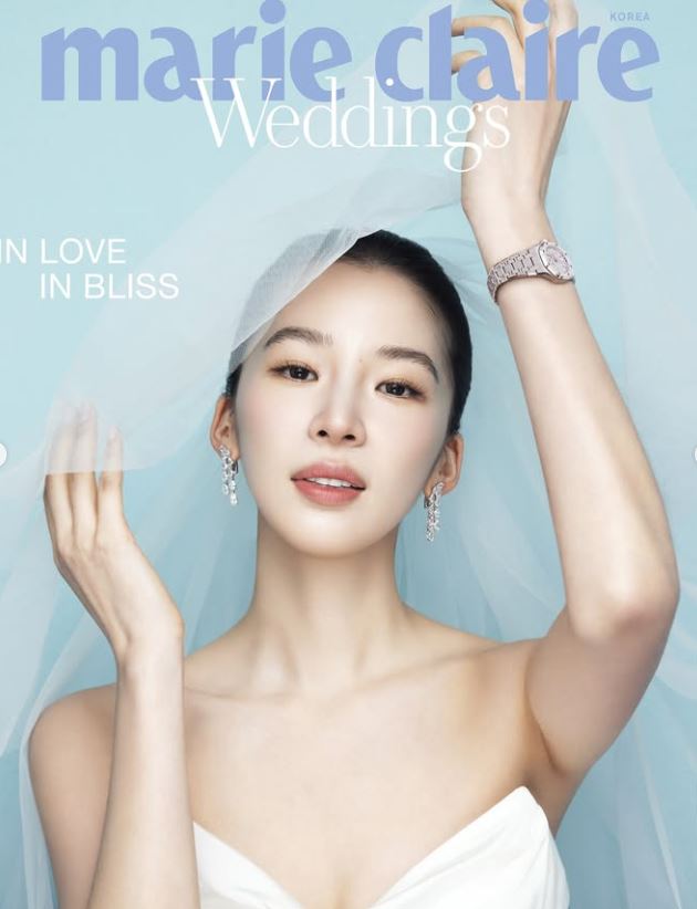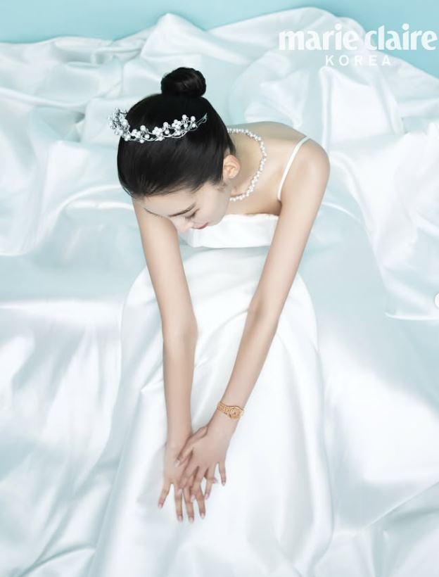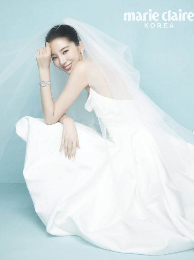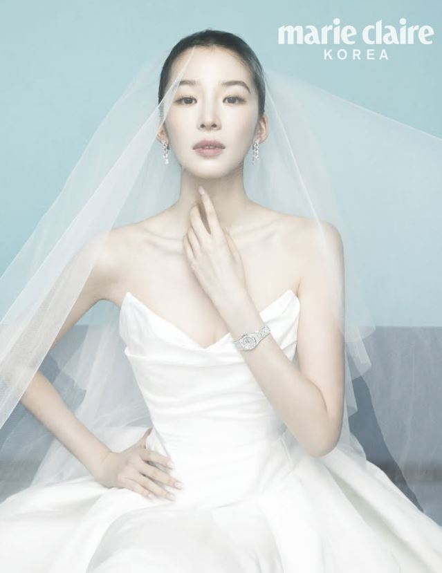 매거진 마리끌레르와 함께 한 웨딩 화보에서 그는 순백의 웨딩드레스를 입고 다양한 포즈를 취했다.