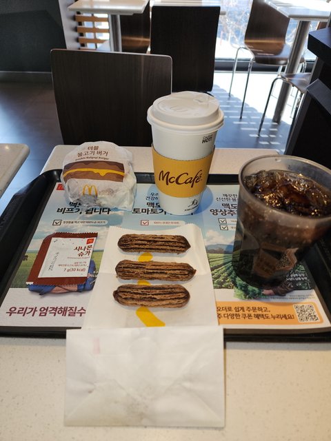(사진1 설명) 오늘 맥도날드 점심식사 촬영 -> (맥도날드) 츄러스 콤보(I love 커피, I love 츄러스), 더블불고기버거, 콜라. <촬영정보: 셔터속도 1/60s, 초점거리 23mm, 조리개 f1.8, 촬영감도 ISO 16, 삼성 S22 Ultra 렌즈 사용, 촬영일자 2025.2.18(화) 오전 11:42, 최대우 촬영, 주소: 서울시 동대문구 답십리로 291-1(장안동)>
