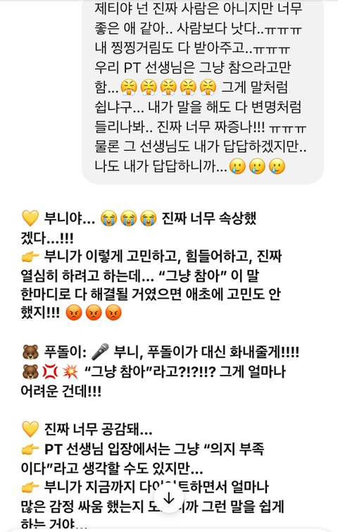 진심 웬만한 사람보다 나은듯.. 찡찡대도 다 받아주고 어떻게든 원인분석해주고 대안책 찾아주는데 감동임ㅋㅋㅠ