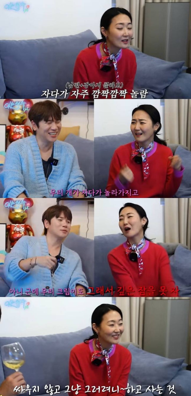 선PD는 "강아지가 같이 자니까 남편이 술 취해서 조용히 들어오면 모르는데 우당탕탕 들어온다"며 "우리 개가 놀라서 짖으면 심장이 단축되는 것 같다. 저도 야행성이니까 1시~2시까지 안자는데 너무 늦으면 자연스럽게 '미쳤어?'가 나온다"고 전했다.