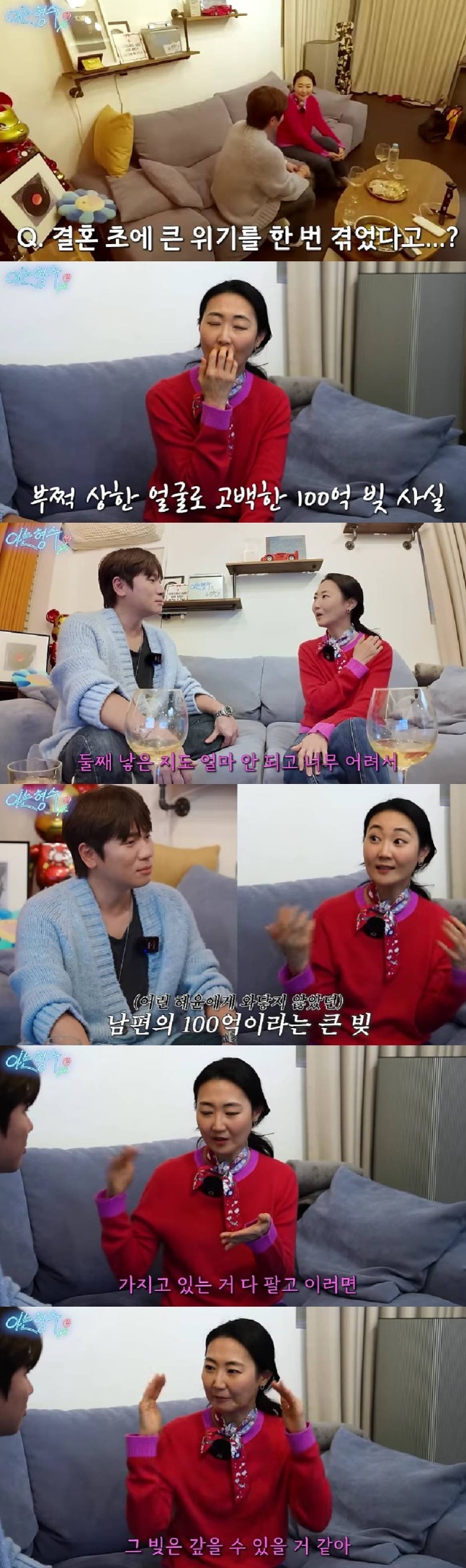 신동엽의 100억 빚에 대해서는 "우리 남편이 빚이 100억이었다"라며 "사람이 갑자기 꼬챙이처럼 마르고 그런다"라며 당시를 회상했다. 신동엽이 사업에 투자했다가 100억 원의 빚을 지게 된 것.