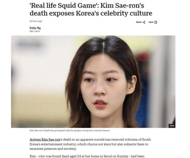아울러 미국 예일대 의과대학 정신의학과 나종호 조교수가 김새론의 비보 이후 소셜 미디어에 "실수하거나 낙오된 사람을 버리고 아무 일 없었다는 듯 지나가는 우리 사회의 모습이 흡사 거대한 '오징어게임' 같다"고 꼬집은 글도 BBC는 덧붙였다.