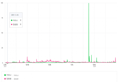 1위 카리나(에스파 2020년 데뷔) 606만 6600건 (10대 : 18.5%, 20대 : 27%, 30대 : 24.8%, 40대 : 20.7%, 50대 이상 : 8.9%)