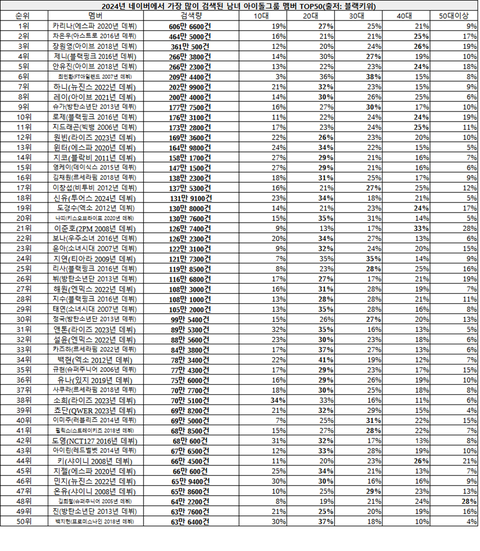 2024년 네이버에서 가장 많이 검색된 남녀 아이돌그룹 멤버 TOP50
