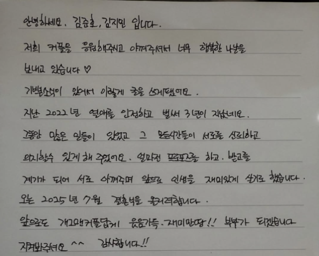 [OSEN=김채연 기자] 코미디언 김준호, 김지민이 오는 7월 백년가약을 맺으며 코미디언 25호 부부가 된다. 손편지로 직접 전한 결혼 소식에 팬들은 물론 대중도 큰 축하를 보내고 있다.