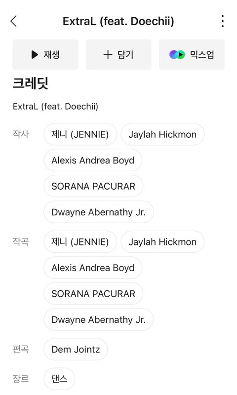 작사 작곡 제니 이로써 지금까지 공개된 제니 앨범 수록곡 만트라 럽행오버 ExtraL까지 전부 작사작곡가나 프로듀서로 제니 이름 올라감 (Zen은 아직 크레딧이 안떠서 모름)