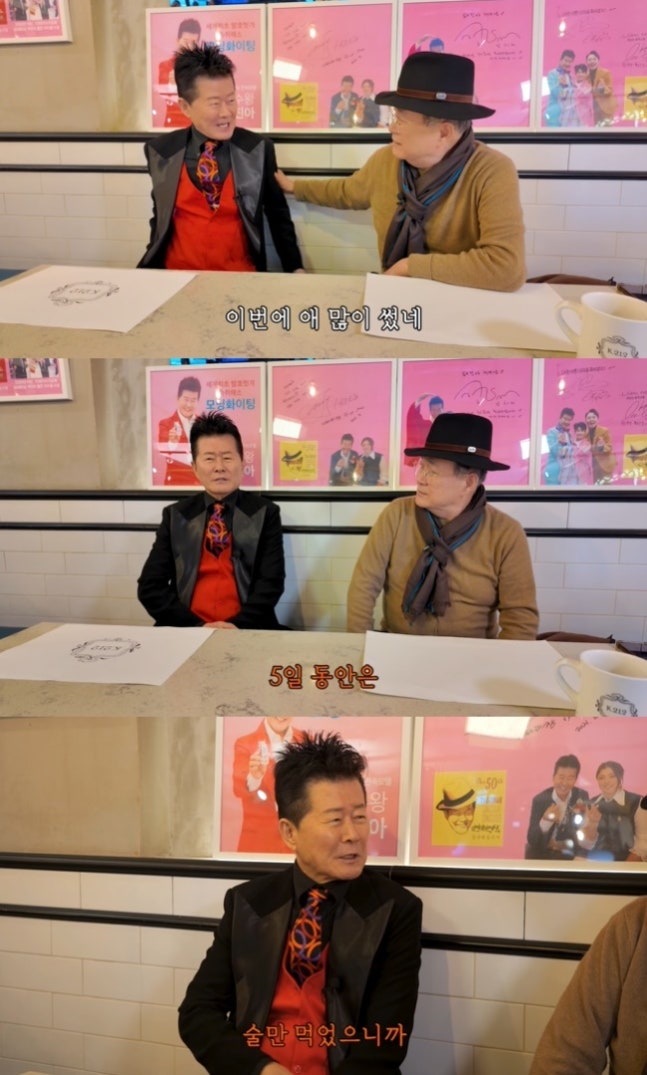 사진=노주현 채널 영상 캡처팬들이 걱정을 많이 한다는 말에 태진아는 “한 5일 동안은 술만 먹었다. 밥을 안 먹고. 안 넘어가니까. 5일 지나면서부터 다시 추스르면서 음식 먹고”라고 근황을 전했다.