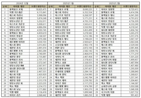 2025년 2월 아이돌 개인 브랜드평판 100위 순위는 아이브 장원영, 블랙핑크 로제, 블랙핑크 제니, 에스파 카리나, 아이브 안유진, 방탄소년단 지민, 빅뱅 지드래곤, 워너원 황민현, 방탄소년단 진, 아스트로 차은우, 방탄소년단 정국, 블랙핑크 지수, 에스파 윈터, 샤이니 키, 방탄소년단 뷔, 아이브 레이, 블랙핑크 리사, 슈퍼주니어 희철, 워너원 강다니엘, 라이즈 원빈, 아이브 이서, 아이브 리즈, 세븐틴 민규, 레드벨벳 아이린, 세븐틴 정한, 엑소 백현, 슈퍼주니어 규현, 에스파 지젤, 시그니처 지원, 빅뱅 태양, 아이브 가을, NCT 마크, 소녀시대 태연, 에스파 닝닝, 샤이니 태민, 방탄소년단 RM, 더보이즈 현재, 르세라핌 김채원, 트와이스 지효, ITZY 유나, 세븐틴 우지, 트와이스 미나, 샤이니 민호, 오마이걸 유아, 키스오브라이프 나띠 , 빅뱅 대성, 레드벨벳 조이, 세븐틴 호시, 세븐틴 준, 라이즈 소희, 세븐틴 도겸, 슈퍼주니어 시원, 세븐틴 승관, 레드벨벳 슬기, 트와이스 다현, 엔하이픈 성훈, 방탄소년단 제이홉, 더보이즈 주연, 르세라핌 사쿠라, 오마이걸 아린, 세븐틴 원우, NCT 도영, NCT 재현, 오마이걸 미미, 여자아이들 미연, 동방신기 유노윤호, 레드벨벳 웬디, 라이즈 앤톤, 트와이스 나연, 마마무 화사, 르세라핌 홍은채, 오마이걸 효정, 르세라핌 카즈하, 레드벨벳 예리, 라이즈 성찬, 프로미스나인 이채영, 샤이니 온유, ITZY 채령, 트와이스 채영, 에이티즈 산, 트와이스 정연, 슈퍼주니어 동해, 프로미스나인 백지헌, ITZY 류진, 에이티즈 홍중, 세븐틴 조슈아, 프로미스나인 이새롬, 더보이즈 선우, 워너원 박지훈, 마마무 솔라, 베이비몬스터 아현, 라이즈 은석, 하이라이트 윤두준, 베이비몬스터 로라, 워너원 옹성우, 워너원 김재환, 에이티즈 종호, 베이비몬스터 아사, 키스오브라이프 벨 , 베이비몬스터 루카 순으로 분석됐다.