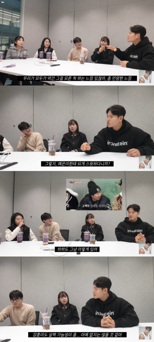 메인 PD가 “되게 스윗하긴 하다”라고 말하자, 김종국은 “예은이한테 되게 스윗하다. 다음 주부터 너희가 한번 봐라. 그러면 보인다. 나는 세찬이가 예은이랑 있을 때 몰래 본다. 진짜 잘 됐으면 좋겠는 사람한테는 끼는 거 아니다. 하하도 요즘 조용하지 않나. 걔가 파토 내는 거 1등인데 가만히 있다. 예은이가 애가 괜찮은 것 같아서 주위에 좋은 남자를 소개해주고 싶다. 강훈이도 살짝 가능성이 좀. 아예 없지는 않을 것 같다”라고 말했다.