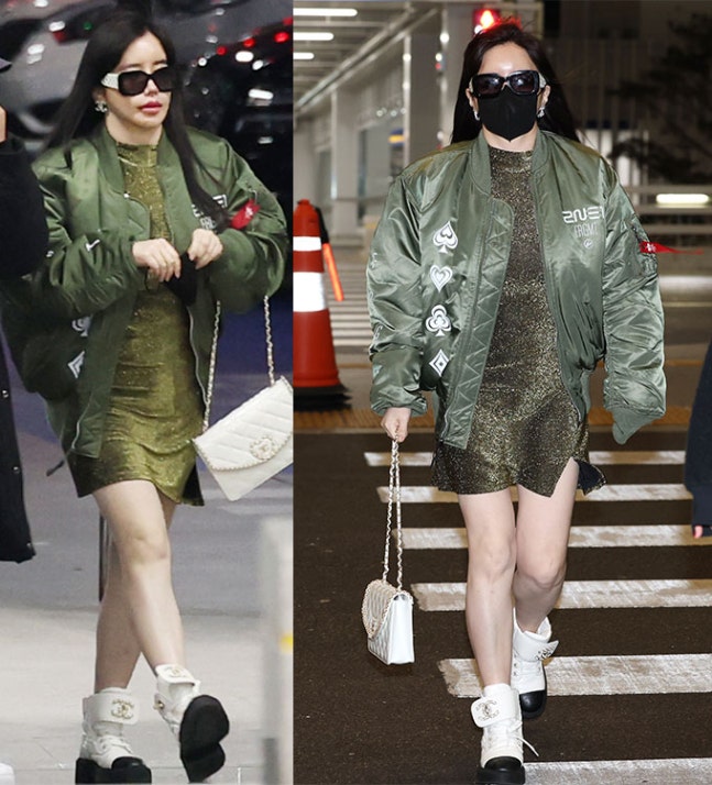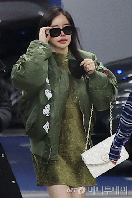 그룹 2NE1 박봄이 21일 인천국제공항 제2여객터미널을 통해 마카오로 출국했다. /사진=뉴스1이날 박봄은 다리가 드러나는 초록색 미니드레스에 2NE1이라 적힌 봄버 재킷을 걸친 모습이었다. 프랑스 패션 브랜드 '샤넬'의 레이스업 부츠와 가방, 귀걸이를 착용해 눈길을 끌었다.