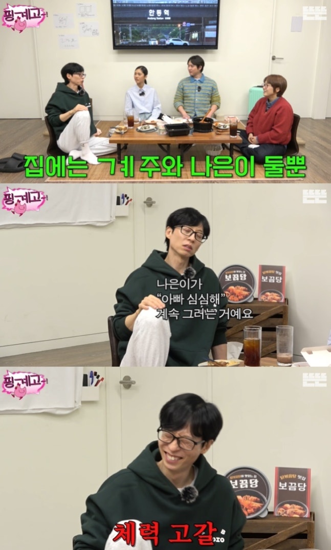 사진=‘뜬뜬’ 채널 ‘핑계고’ 영상 캡처송은이가 “어제 집에 가니까 피곤하더라”고 말하자, 유재석은 “내가 낮잠을 안 자는데 어저께 두 시간을 잤다. 어저께 한 다섯 시에 들어갔나? 갔는데 너무 잠이 오는 거다. 나은이랑 있었는데 ‘아빠 심심해’ 계속 그러는 거다. ‘나은아, 아빠가 너무 졸리거든? 너도 같이 좀 자자’라고 했다. ‘아유, 아빠 심심해’ 하다가 나은이도 같이 잠들었다”라고 전했다.