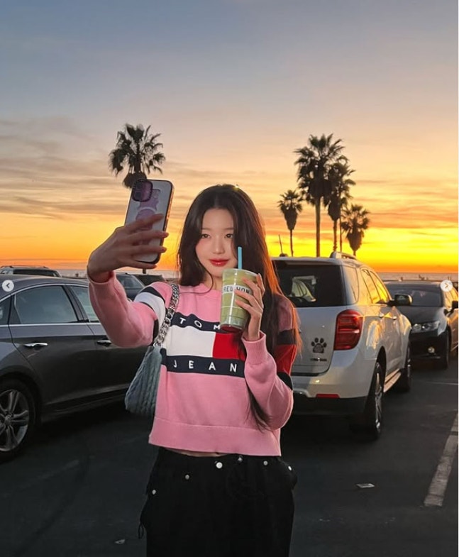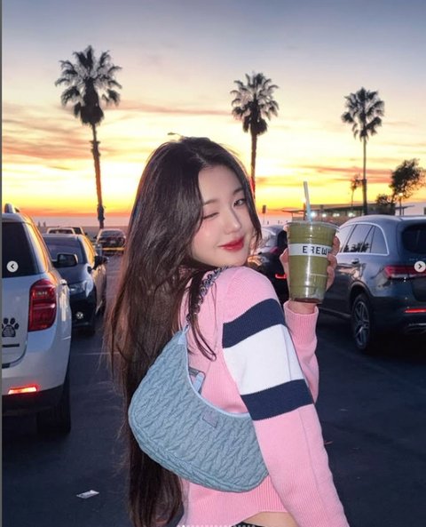 어깨에는 퀼팅 디자인의 하늘색 가방을 멘 모습이다. 사진 배경에는 노을이 물든 하늘과 야자수가 어우러져 감성적인 분위기를 더한다. 특히 그녀의 긴 머리와 세련된 포즈가 더해져 마치 화보를 연상케 한다.
