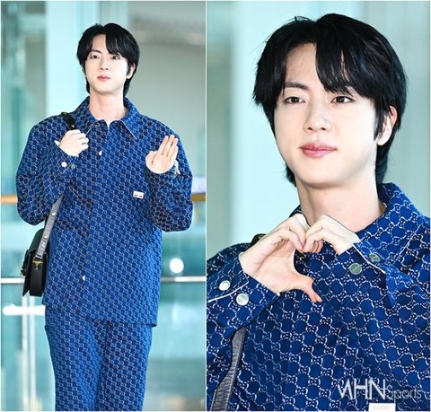 BTS 진은 브랜드 로고가 포인트 된 블루 계열의 팬츠와 재킷의 셋업 룩에 블랙 숄더백을 매치해 캐주얼하고 유니크한 패션을 완성시켰다.