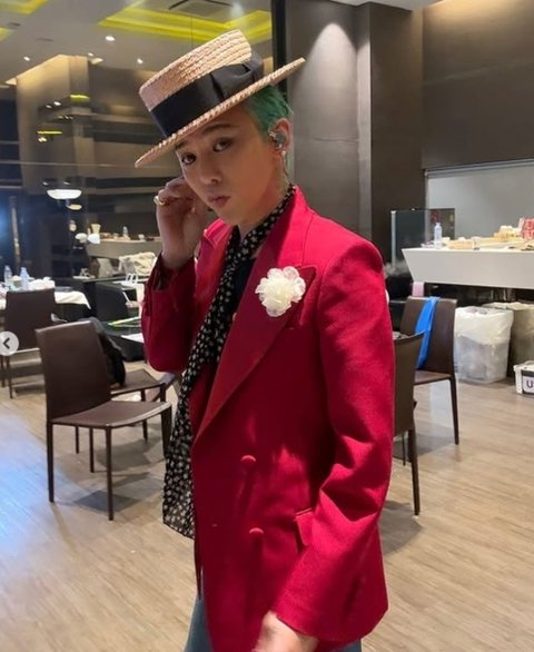 사진=지드래곤 부계정지드래곤은 페도라에 강렬한 레드 재킷, 블랙 패턴 셔츠로 화려한 면모를 보였다. 여기에 녹색으로 염색한 헤어 스타일에 꽃모연 브로치까지 착용했다.