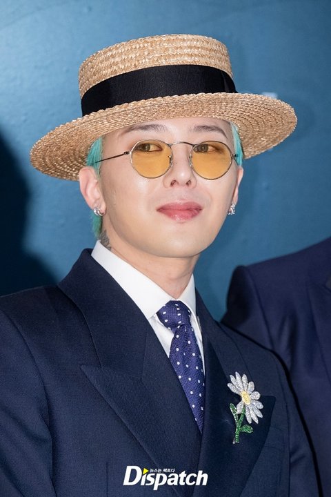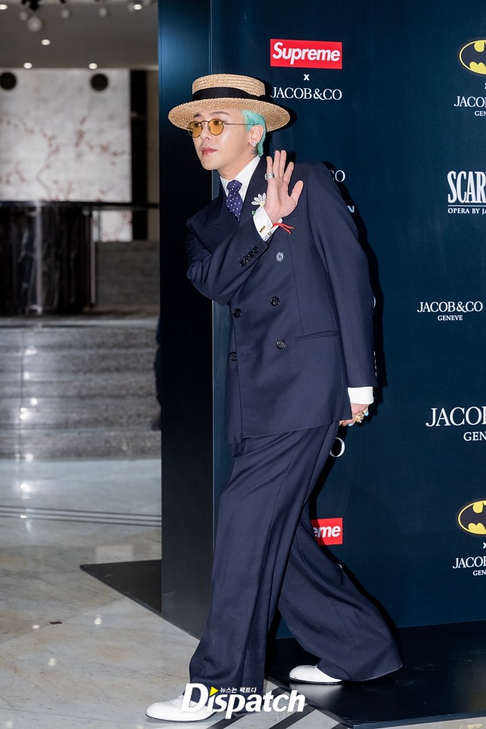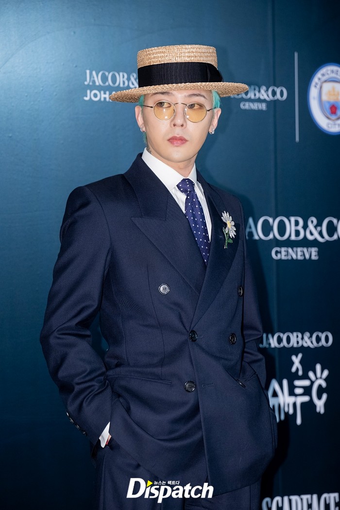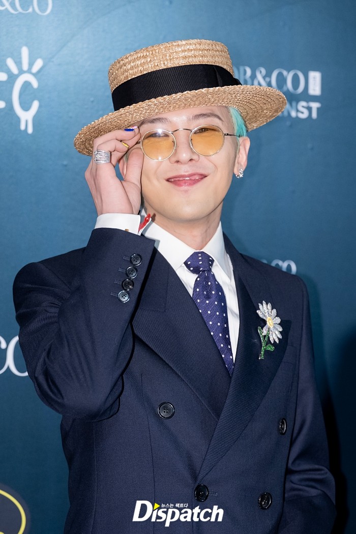 지드래곤은 네이비 수트로 멋을 냈다. 화려한 컬러의 헤어스타일과 페도라로 포인트를 줬다.