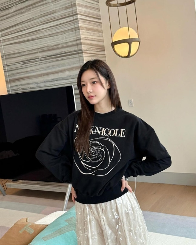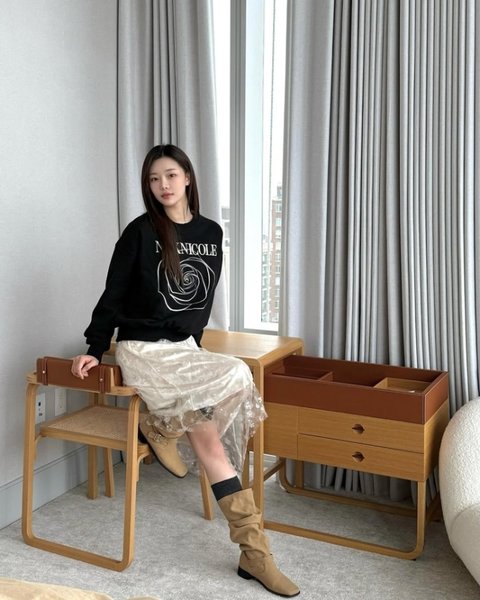 사진 속 이시안은 화이트 시스루 스커츠에 장미꽃이 그려진 검정 맨투맨을 매치해 봄 맞이 화사한 룩을 완성시켰다. 신발은 베이지색 스웨이드 부츠를 신어 포인트를 줬다.