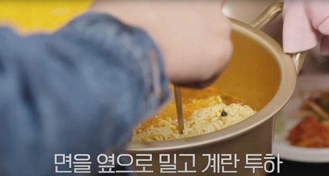 면을 옆으로 바짝 밀어 붙여서 공간을 만든 다음 계란물 투하