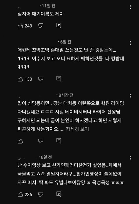 이수지가 막 제이미 맘 이러면서 대치동 엄마들 따라하는거 영상 올렸잖아 근데 이 영상 전에 한가인이 24시간 관찰 카메라라는 영상을 올렸는데 이 영상이랑 이수지 대치동 영상이랑 대사랑 구도도 비슷하고 더군다나 한가인 딸 이름이 제이여서 비슷한게 너무 많으니깐 사람들이 한가인 영상에 가서 조롱같은 악플 써서 결국 한가인이 저 영상 비공개 처리 했는데 이거 어케 생각해? 타 커뮤에서는 이수지 욕 ㅈㄴ 먹고있음