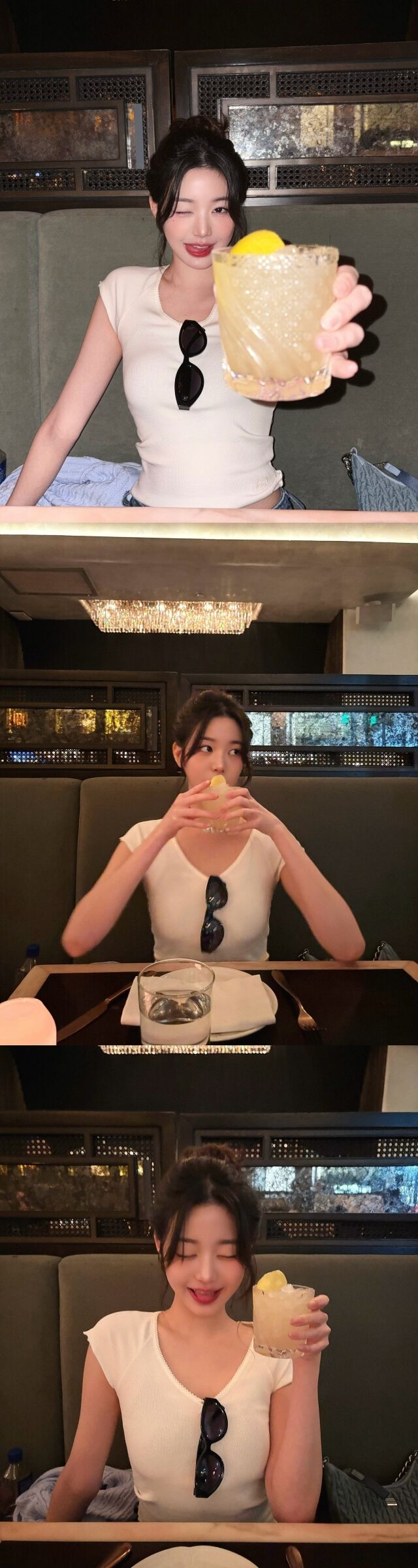 공개된 사진 속 장원영은 여행을 떠난 듯한 모습이다. 그는 머리 위에 선글라스를 얹고 손에 잔을 든 채 윙크를 하거나 다양한 표정을 지어 보이며 사랑스러운 분위기를 연출했다.