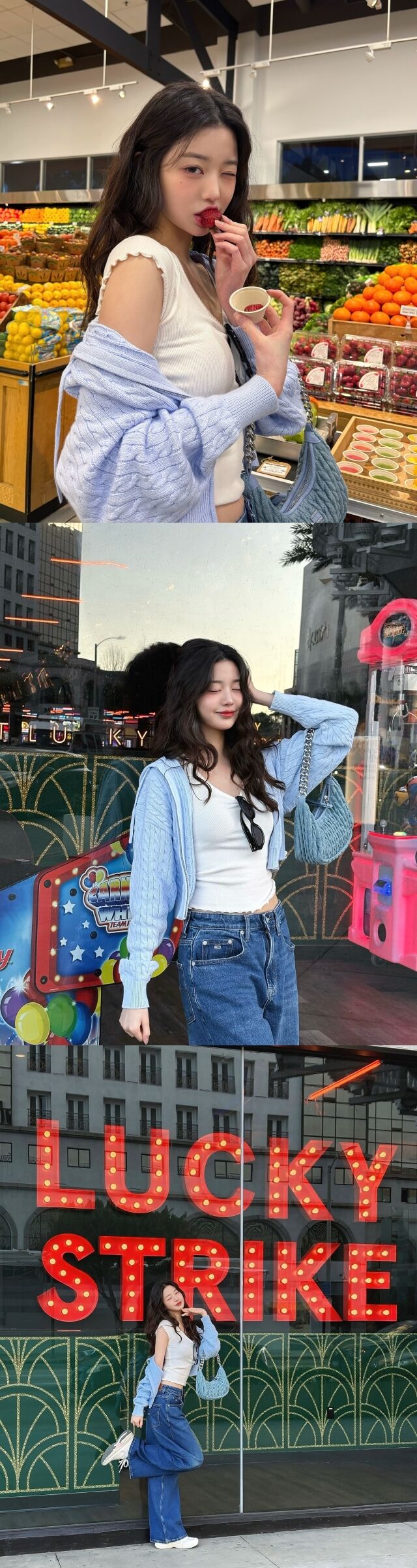 그룹 아이브 멤버 장원영의 여행 일상 / 장원영 인스타그램또 다른 사진에서는 하늘색 카디건 안에 민소매를 매치해 산뜻한 느낌을 자아냈으며, 청바지와 크로스백으로 캐주얼한 패션을 완벽하게 소화했다. 특히, 긴 웨이브 헤어스타일과 여유로운 표정에서 장원영 특유의 독보적인 아우라가 느껴진다.