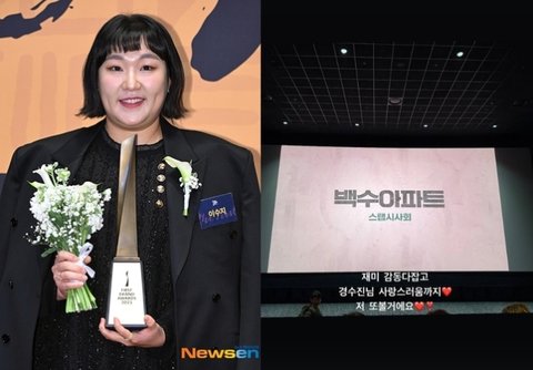 이수지는 2월 25일 개인 소셜미디어를 통해 영화 '백수아파트' 스태프 시사회 참석 인증샷과 함께 "재미 감동 다 잡고 경수진 님 사랑스러움까지. 저 또 볼 거예요"라는 글을 덧붙이며 응원을 전했다.