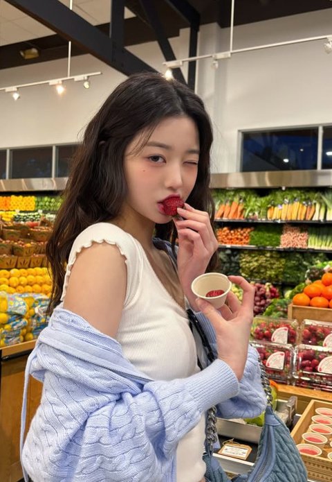 공개된 사진 속 장원영은 머리를 묶은 채 윙크를 하며 다양한 포즈를 취하고 있다. 반팔 브이넥을 입은 채 식사를 즐기고 있는 모습. 이어진 사진에서는 마트를 배경으로 한손으로 딸기를 집은 채 상큼한 포즈를 표정을 짓고 있다.
