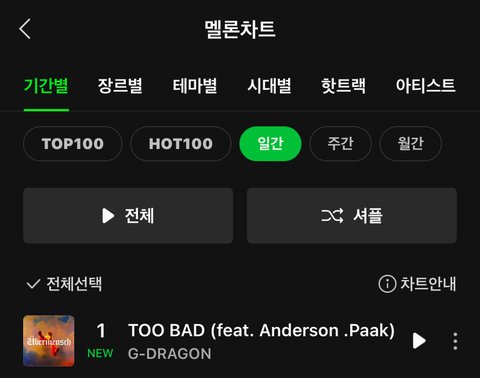 지디 Too Bad 일간 진입 1위