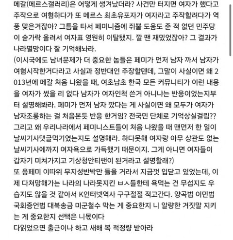 (이시국에도 남녀문제가 더 중요한 놈들은 페미가 먼저 남자 까서 남자가 여혐시작한거다라고 사실과 정반대인 주장할텐데, 그말이 사실이면 왜 2013년에 메갈 처음 나왔을 때, 여초남초 한국 모든 커뮤니티가 이런내용을 여자가 썼을 리 없다 남자가 여자인척 쓴거 아니냐는 반응이었는지부터 설명해봐라.