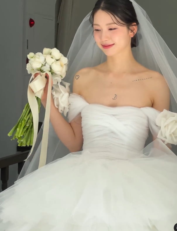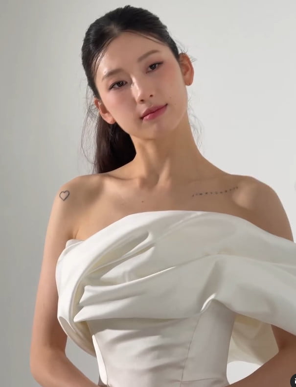 공개된 게시물들 속에서 김진경은 화이트 웨딩드레스부터 시작해 다양한 복장을 착용한 채 사진 촬영에 임하고 있는 모습. 특히 어깨와 쇄골 그리고 가슴 라인과 목 뒤 등 신체 여러 부위에 타투들을 새긴 상태를 보여 보는 이들의 시선을 사로잡았다.