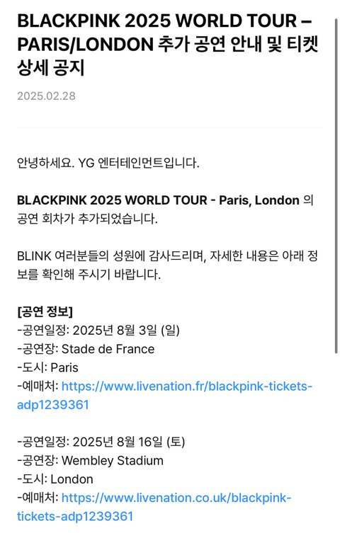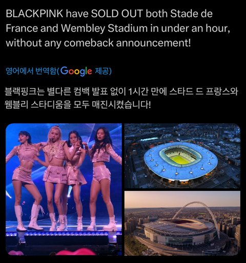 런던 웸블리랑 파리 스타드 드 프랑스 스타디움 1시간도 안돼서 둘다 매진이라는데..? ㄷㄷ 추가콘 열듯