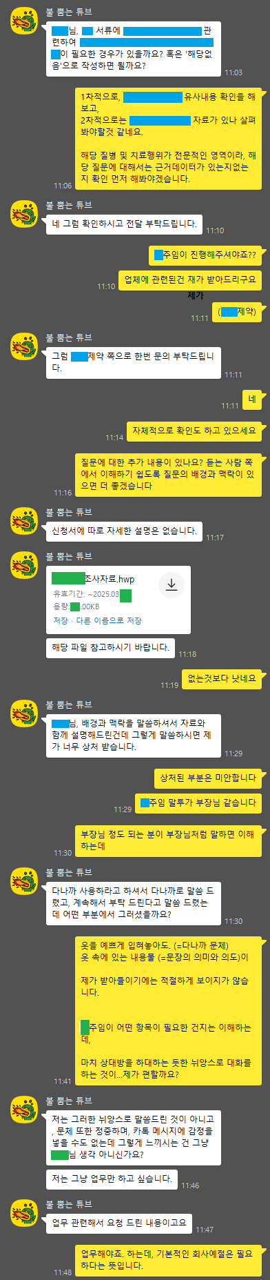 아래 대화는 회사에서 저(40대초, 4번째직장)와 직원(20대말, 1번째직장)간 발생한 대화입니다.