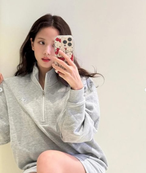 지수 소셜미디어공개된 사진 속 지수는 품이 넉넉한 회색 맨투맨 티셔츠에 짧은 반바지, 양말과 스니커즈를 착용한 모습이다.