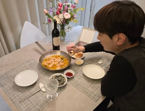 사진 속 민경훈은 신혼집으로 보이는 테이블에서 감바스와 와인을 먹으며 저녁을 즐기고 있다.