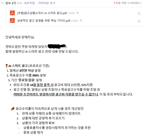 그런데 왠열 메일들어가보니?????없음ㅋㅋㅋㅋ확인결과 메일에 첨부파일로 온 가이드라인은 광고를 어떻게 설정하고 이용하는 방법에대한 전체가이드라인이였음광고 이용방법 그냥 전체문자같은느낌 광고 온오프하는방법이나와있음그리고 첨부파일말고 담당자가 나한테 직접 타이핑해서 작성한 글 에는오히려 어떠한 조건도 변경하면 지원못받는다고 나와있지 2주뒤에 해지해야한다는 안내는없음