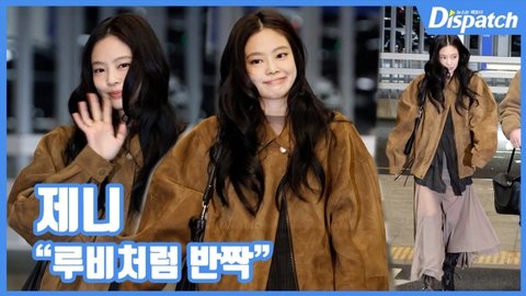이날 제니는 스웨이드 재킷에 샤스커트를 매치해 우아하고 여성스러운 공항패션을 완성했다.