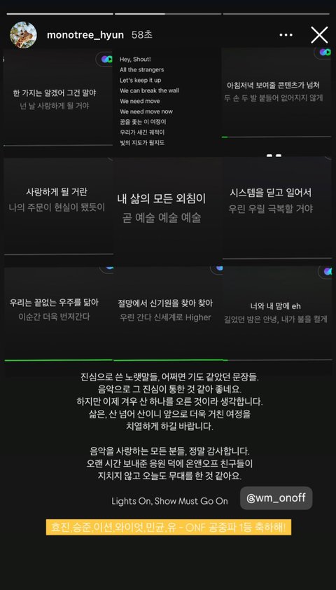 순위예측에서 온옾 첫 1위각이라서 음방에 온옾 소속사 대표랑 온옾 전담 작곡가 황현도 왔대ㅋㅋㅋㅋ 황현은 온옾 엄청 아끼는거 같음 멤버 입대할때도 따라가고 ㄹㅇ 황버지...이건 온옾 1위하고 올린 인스스